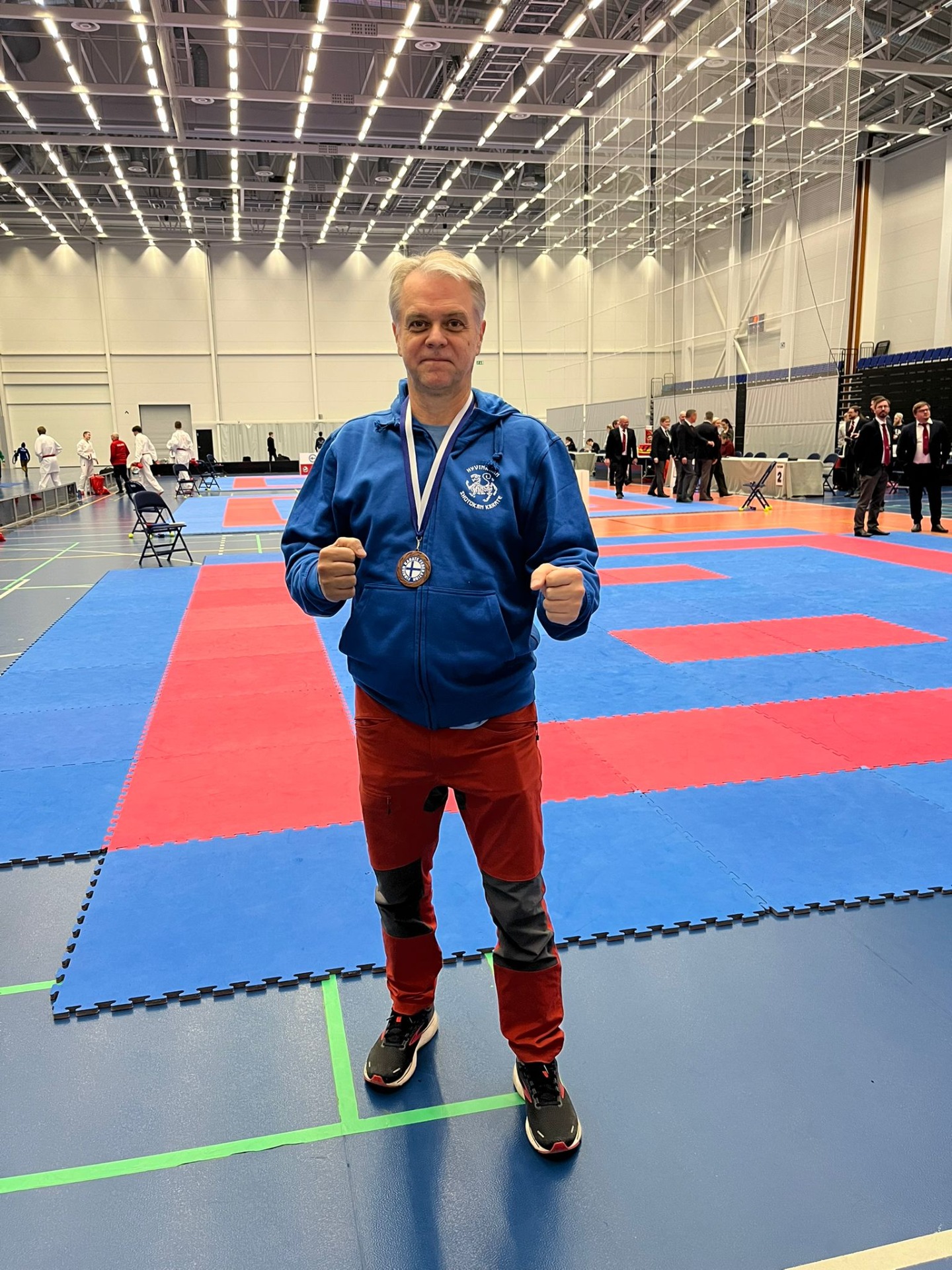 Hyvinkään Shotokan Karaten päävalmentaja Vesa Tuomiselle prossia 28.3.2026 Hämeenlinnassa pidetyissä Karaten SM kilpailuissa +40v kata sarjassa.